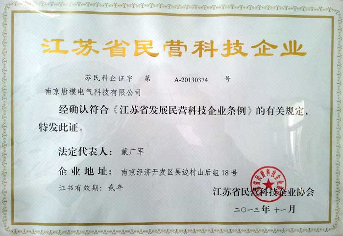 南京唐模电气科技有限公司获得江苏省2013年第二批《江苏省民营科技企业》称号。